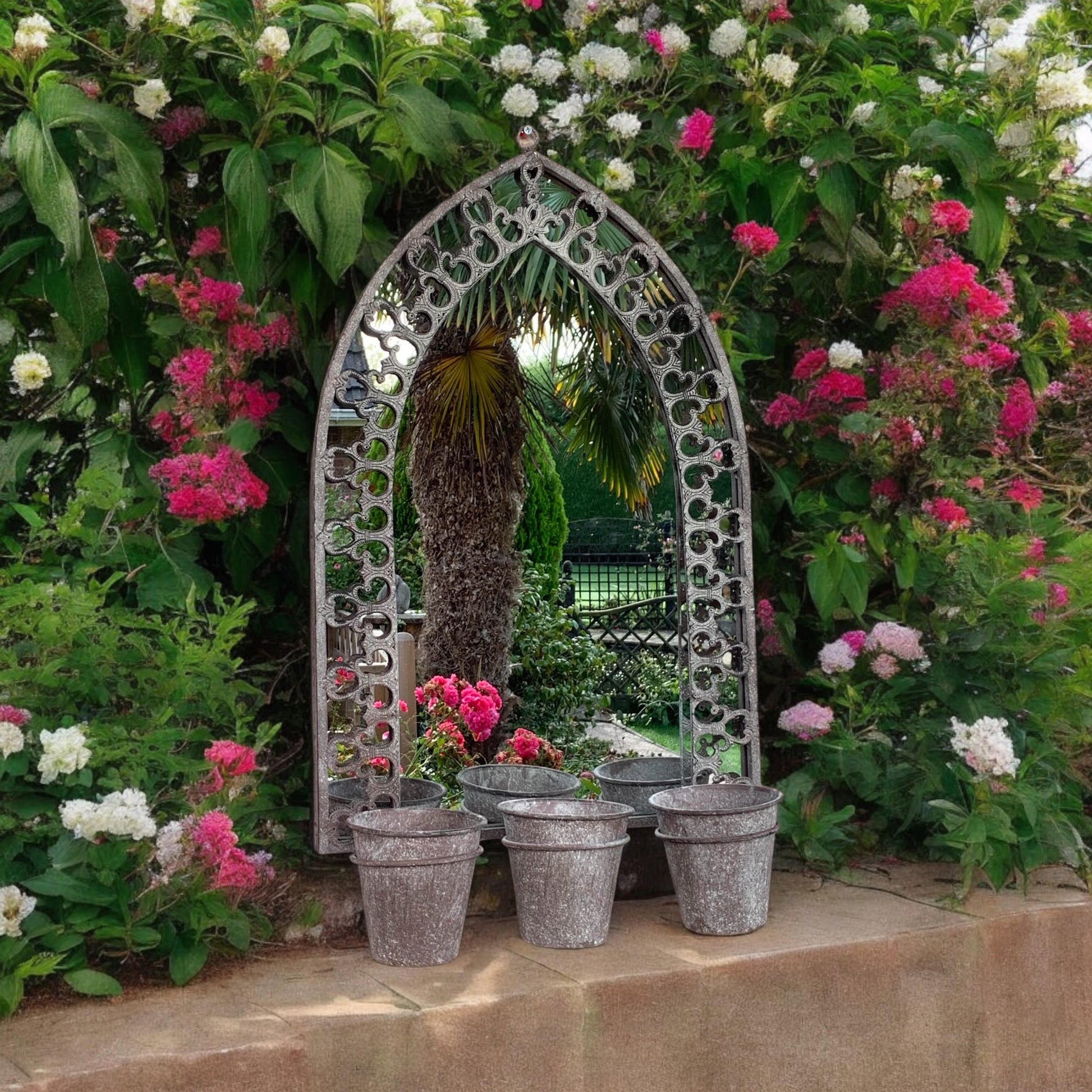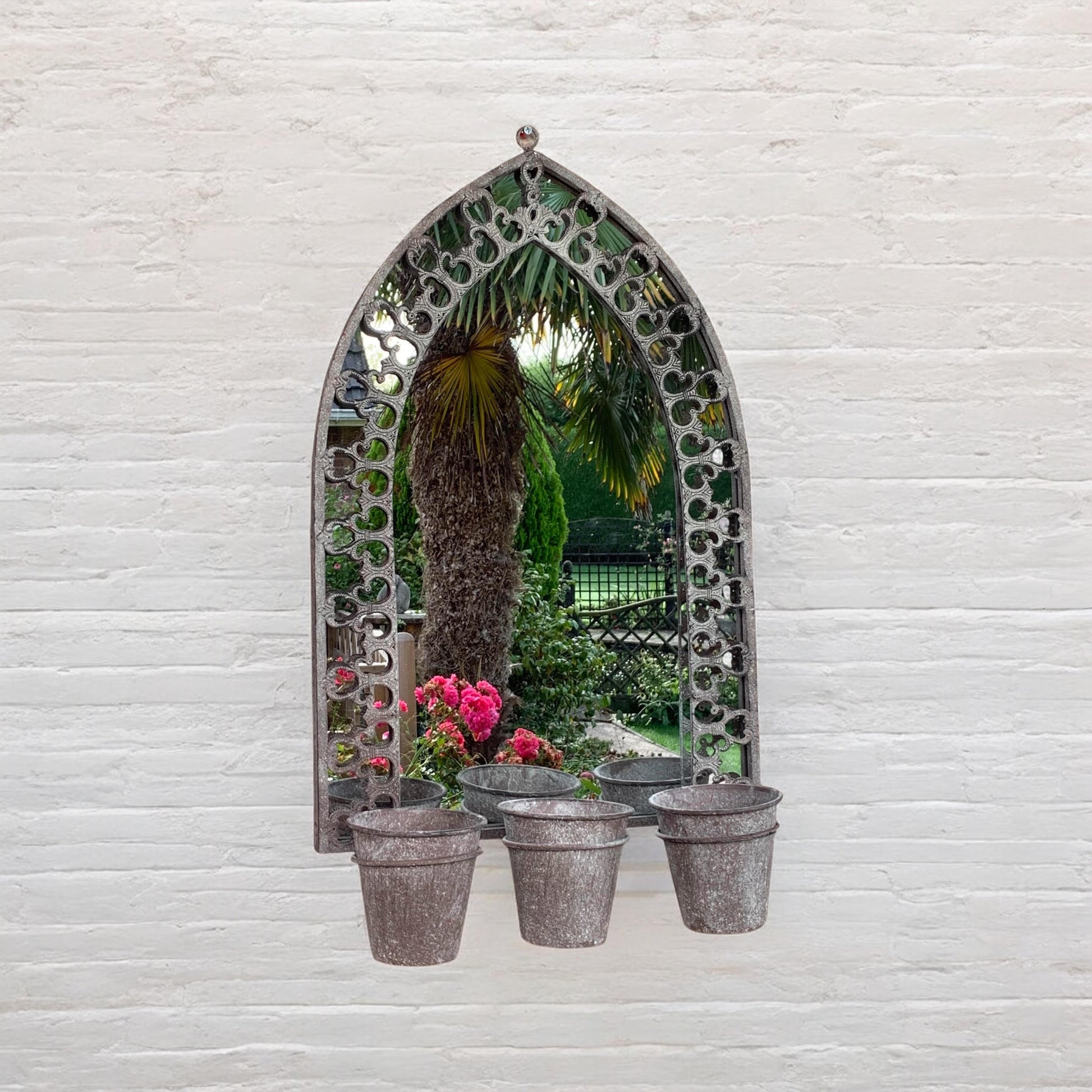 A decorative metal mirror with an antique finish complete with 3 planter holders and pot.