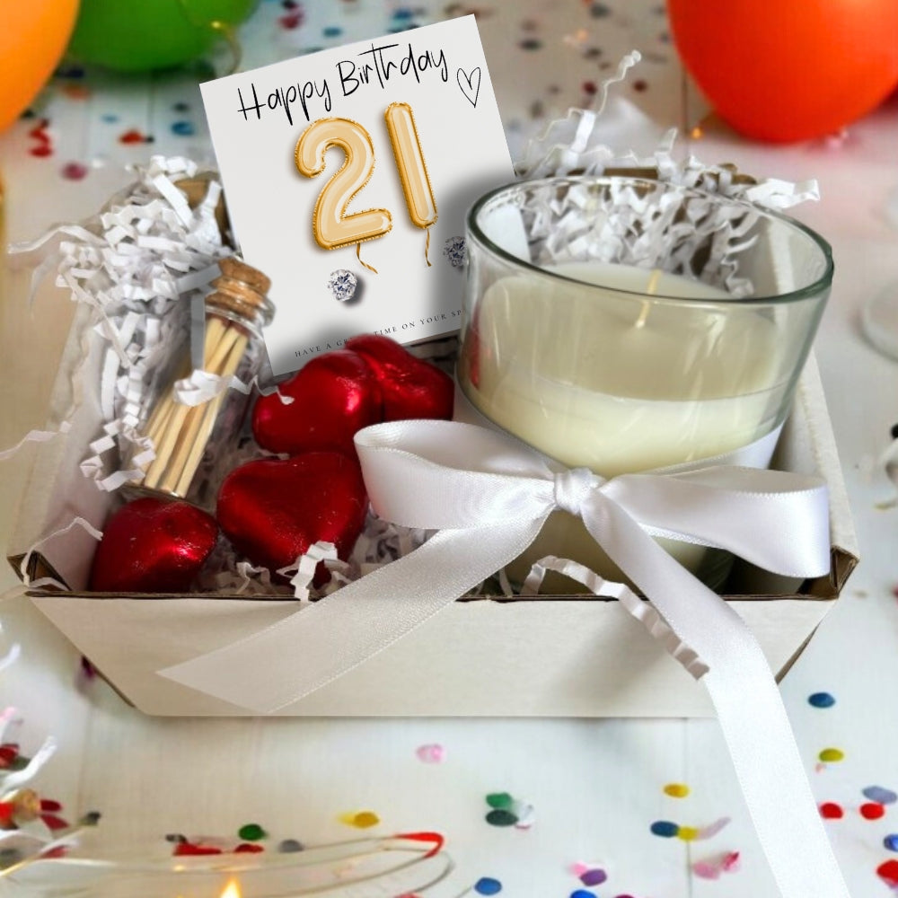 This sparkly small 21st Birthday Gold Balloons gift hamper includes cubic zirconia stud earrings, presented on a message card with the phrase "Happy Birthday Have A Great Time on Your Special Day". Additionally, the set comes with a pretty linen scented candle with matches and four delicious milk chocolate hearts filled with creamy caramel centre. Perfect for Mothers, Daughters or Friends to celebrate a special milestone birthday this delightful gift offers a small section for a personal note or the choice to keep it blank.